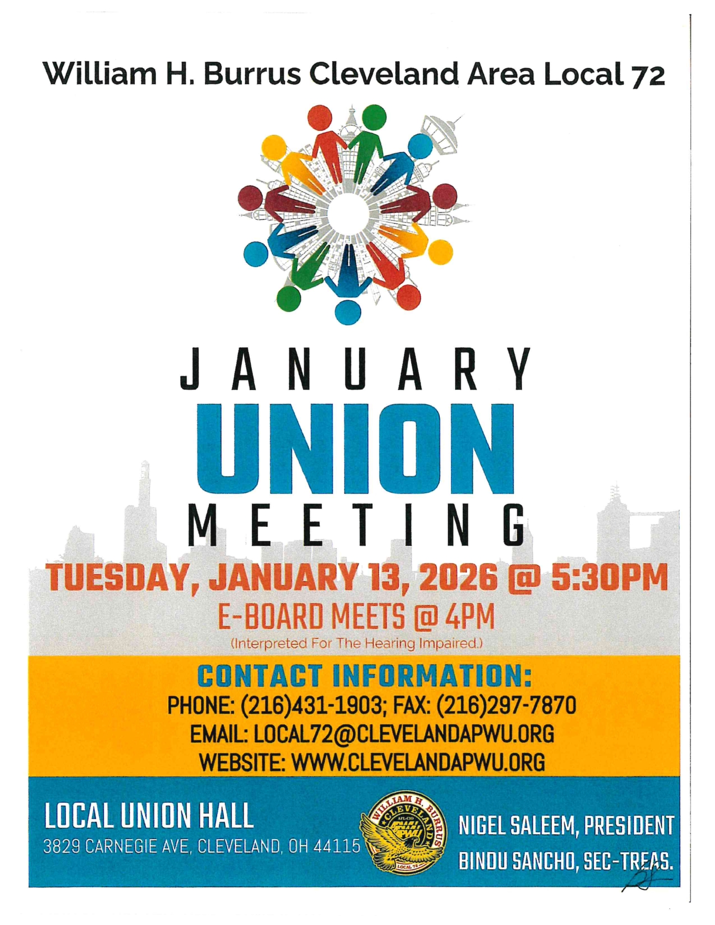 01/08/26 - CWA Local 1103 To 1103 Stewards and Chief Stewards, On behalf of CWA's Local 1103 Executive Board, I would like to publicly acknowledge and express our gratitude for your attendance at last night’s meeting. We recognize the immense value of your time and are particularly appreciative that you shared it with us. Your presence exemplified your leadership and union solidarity. |